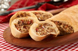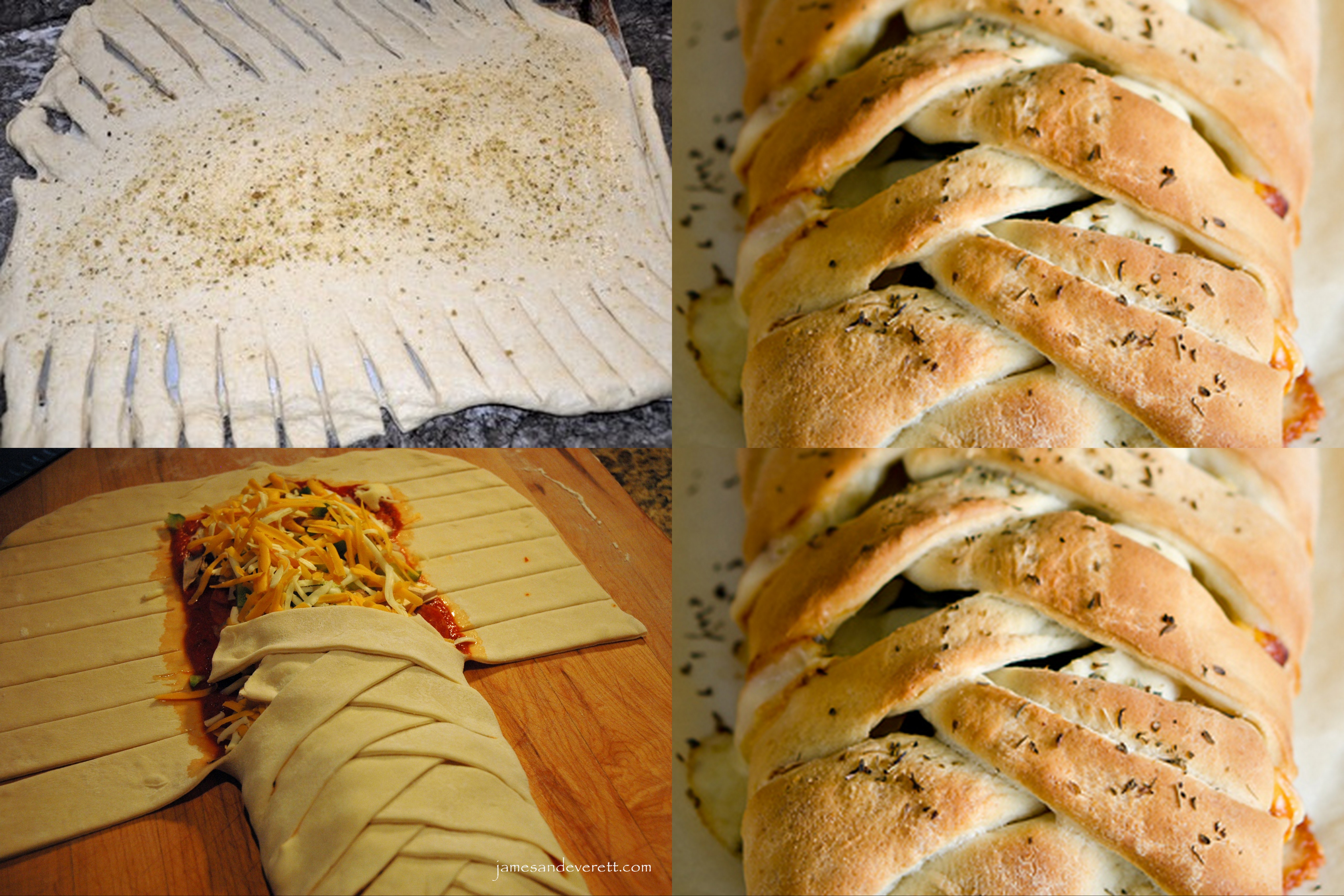 See photos to help clarify the following steps: Working lengthwise, spread your toppings down the center. (I use spicy brown mustard, ham, red onions, Italian seasoning and mozzarella cheese.) Use kitchen shears to cut the long sides into strips. Pull the strips over the filling. If desired, brush with egg wash or melted butter, then bake 12-14 minutes.