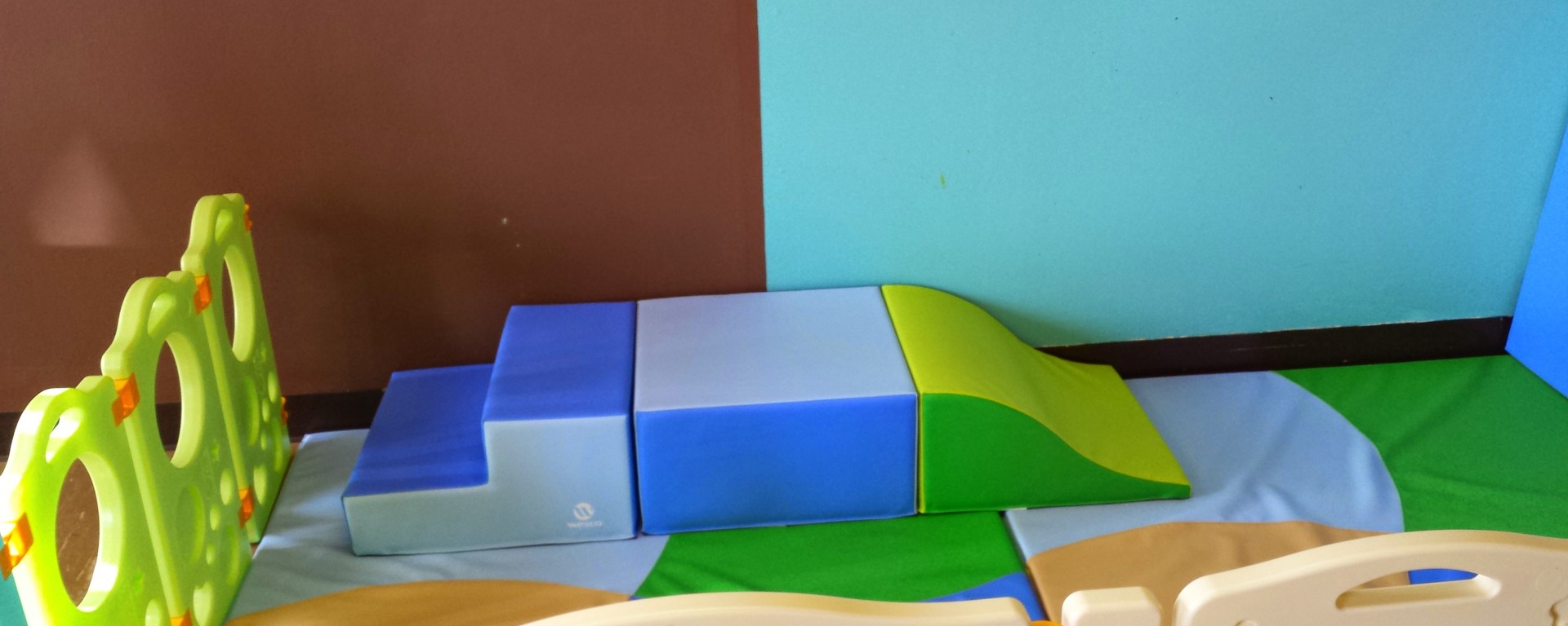 First of all, I had a hard time finding the products I’ve seen in crawler zones at libraries and children’s museums. I didn’t know what they were called. My advice to you is, do a Web search for “soft play toddler.” You can go to the company websites and request catalogs if that’s your preferred method of browsing. Wesco brand products will come up quite frequently. I ended up selecting Wesco floor mats, wall mats, and “tiny tot module” (the climber/slide) that were in keeping with the colors in our classroom.